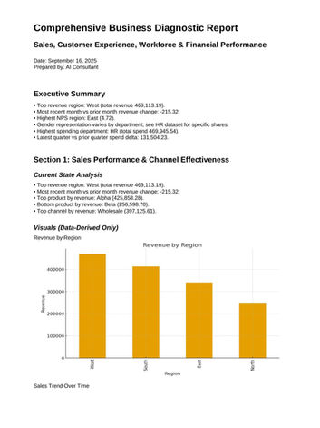 Provide four key files — CRM data, Finance data, HR data, and Sales data. AI consolidates these datasets into a unified analysis that highlights performance trends, bottlenecks, and opportunities. The final package includes a comprehensive performance report delivered in CSV, Excel, Word, PowerPoint, and PDF formats, giving you actionable insights across your business functions.